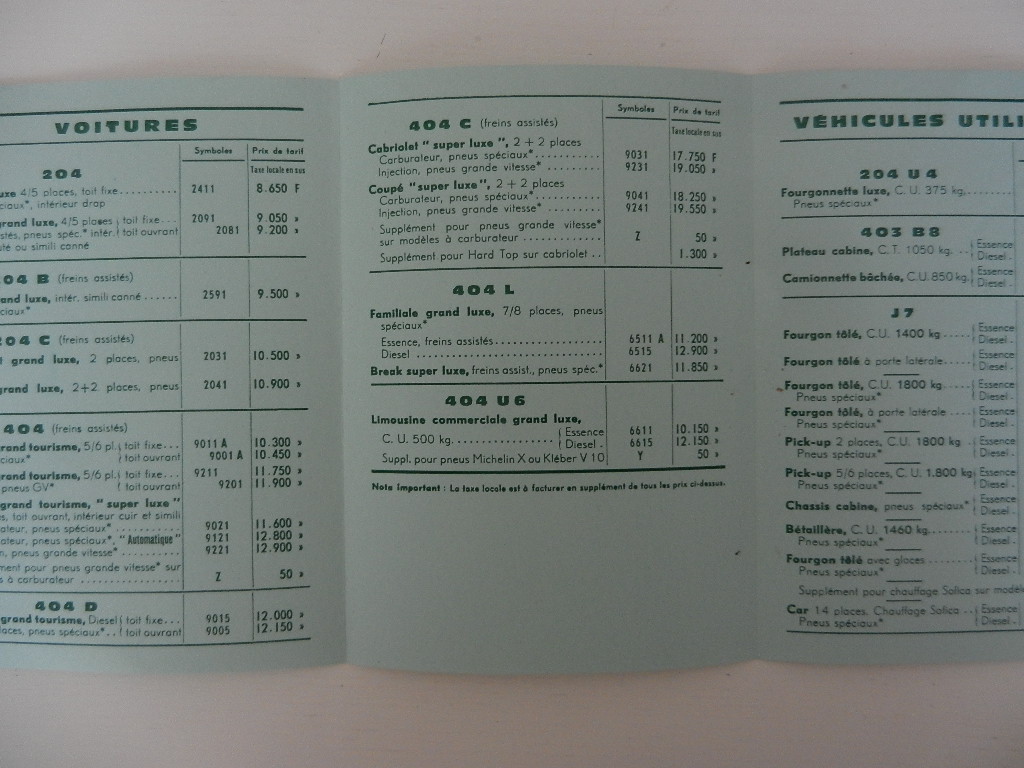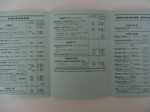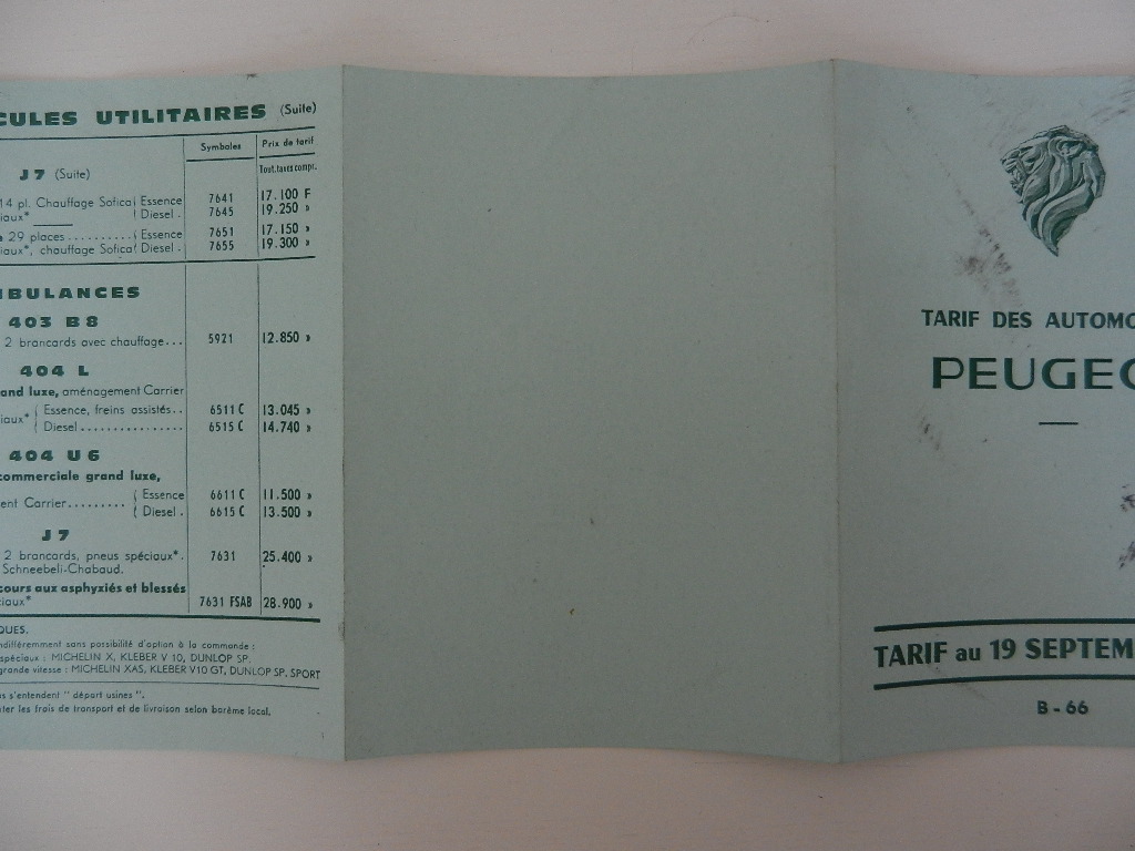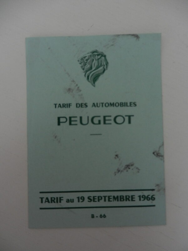 1 petit catalogue Peugeot Tarif au 19 septembre 1966 réf : B – 66 204, 404, 403, J7 6 pages en Français bon état, quelques taches.