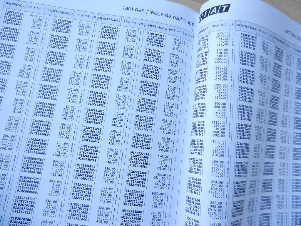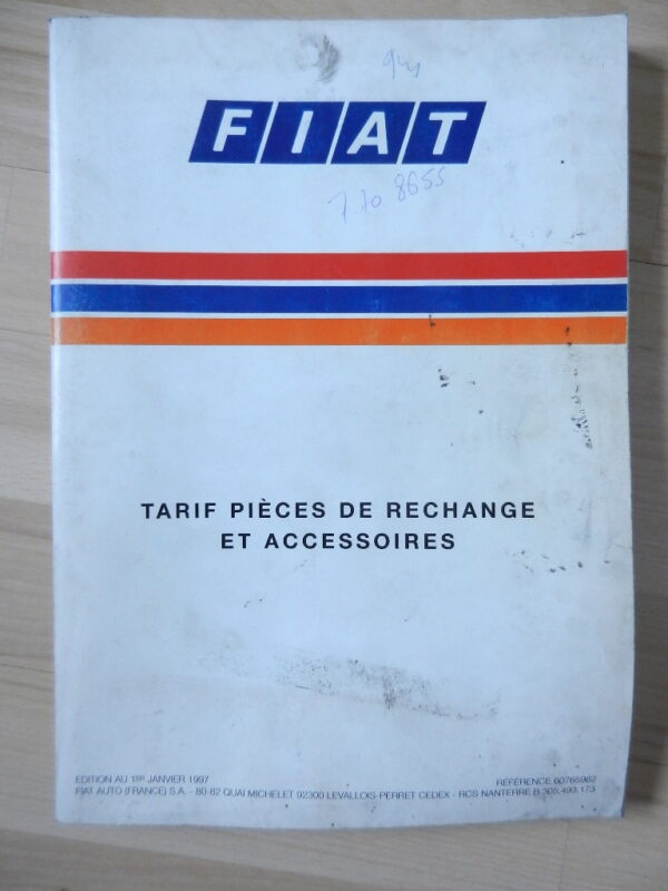 Document d’origine constructeur Fiat tarif pièces de rechange et accessoires Édition au 1er janvier 1997 Ref: 60765962 218 pages Bon état d’usage